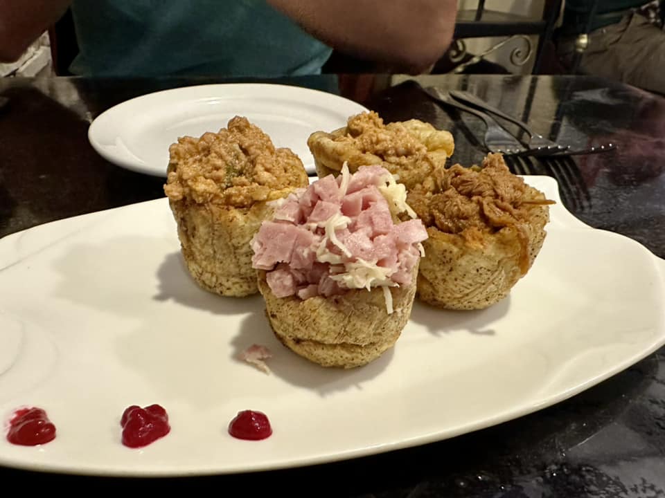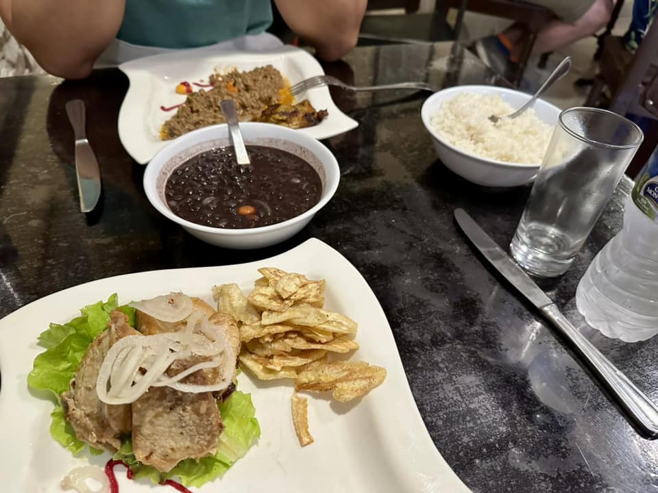 Doña Eutimia is another one of these well reviewed paladares, and the food here was pretty okay. We started with tostones rellenos, cup shaped twice fried plantains filled with ham and cheese, ropa vieja, and picadillo. They were a tasty bite and I like the idea of using them as a sort of canapé base. I had masa de cerdo, chunks of pork fried in oil until tender and seasoned with mojo sauce. David had classic picadillo. They both came with white rice and black beans on the side. This meal was better than most of what we’ve had in Cuba, but not stunning.