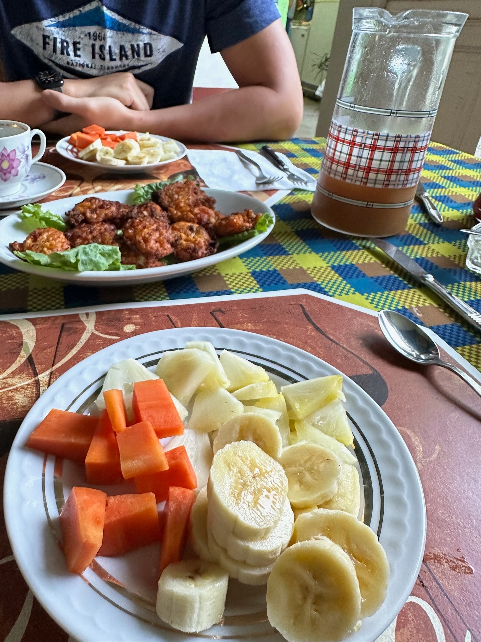 We also spent a fair amount of time chatting with the hosts of our casa particular, Teresa and Rodolfo. I thought this was the most interesting thing we did in Trinidad. There was still a bit of a language barrier, but from them, we learned a lot more about what life in Cuba was really like, how they dealt with all the ingredient shortages and power outages (which were particularly severe in Trinidad, even for the short time we were there), what they thought about the rest of their family moving to Miami, and more. Rodolfo had very cool grandpa energy, walking around shirtless in jeans, and saying "¿Cómo están, jóvenes?" ("What's up, youngins?") every time he walked into the room; I hope to be like him one day. And Teresa must have really taken to us, because by our final morning there, our breakfasts had evolved from the very standard casa particular breakfast that we had eaten everywhere, to a feast featuring fresh tamarind juice (instead of a bland fruit shake or Tang), super flavorful and crispy vegetable fritters, the best coffee we'd had on the entire trip, and actual real honest-to-god butter for the bread, in addition to all the standard fixings. Objectively, we may have had better meals in Cuba, but this final meal felt like the best one we'd had on the whole trip, because we knew at this point how rare a lot of the ingredients were, especially to the home cook, and it meant a lot to us that Teresa wanted to treat us to something special.